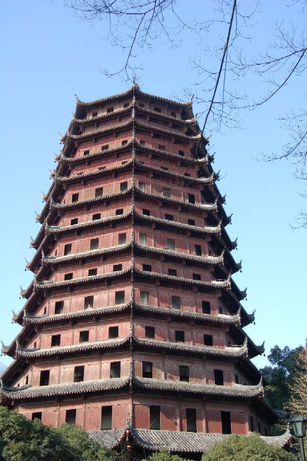 《杭州 六和塔》 宋代の970年、呉超王の銭俶によって建てられた塔。当時は海水が高波となって押し寄せ反乱を繰り返していたため、鎮めるための慰霊塔として建造された、13層8角で、高さは60m、最上階までは石と木の急な「らせん階段」を上らなければなりません。でも最上階からは海水が押し寄せた川、「銭塘江」など壮大な景観が望めます。銭塘江は、現在では海水が逆流する川として有名になりました。